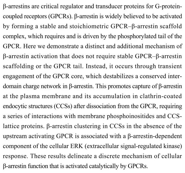 (导读 陈月欣)β-抑制蛋白是G蛋白耦合受体(GPCR)的重要调节及传导蛋白。β-抑制蛋白的活化一直以来被认为需要GPCR的磷酸化尾部。本研究发现另一种活化机制:GPCR内核部分可改变β-抑制蛋白内部的电子网,使β-抑制蛋白积聚于网格蛋白包被的内吞结构(CCS)中,进而激活胞内ERK。