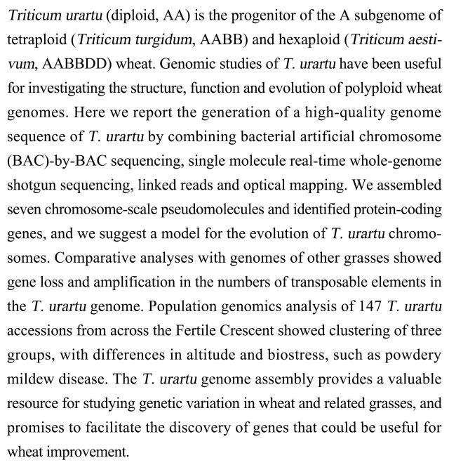 (导读 陈月欣)双倍体乌拉尔图小麦是 A亚基因组四倍体和六倍体小麦的祖先。本研究通过结合细菌人工染色体测序,单分子实时全基因组鸟枪法测序,关联序列和光学图谱等方法,制作出了高质量的乌拉尔图小麦基因组序列,并在此序列的基础上提出了乌拉尔图小麦染色体演化模型。