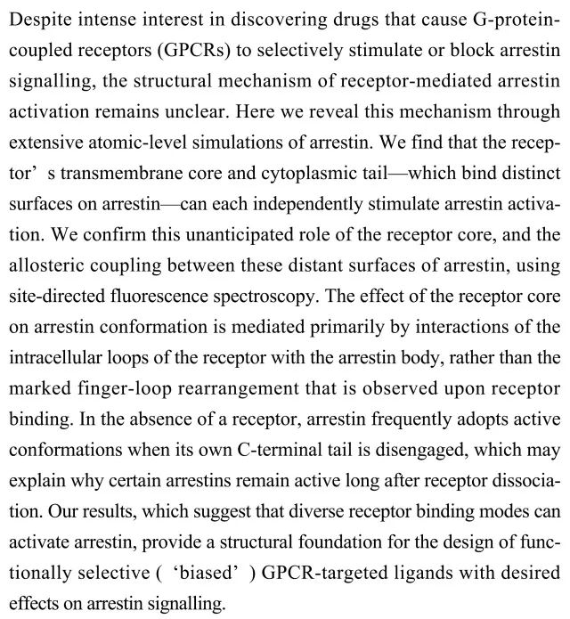 (导读 郭怿暄)通过作用于 G蛋白偶联受体选择性激活或阻断视紫红质抑制蛋白(arrestin)是当前药物设计的热门靶点,但结构机制尚不清楚。本研究发现受体的跨膜核心及细胞质尾巴结合于 arrestin 表面的不同部位,可分别使其激活。受体核心主要通过胞内环与 arrestin 主体相互作用介导 arrestin 构象改变。没有受体时 arrestin 在 C末端脱离状态下常呈现激活构型。这一发现为功能选择性药物设计提供结构基础。