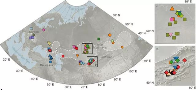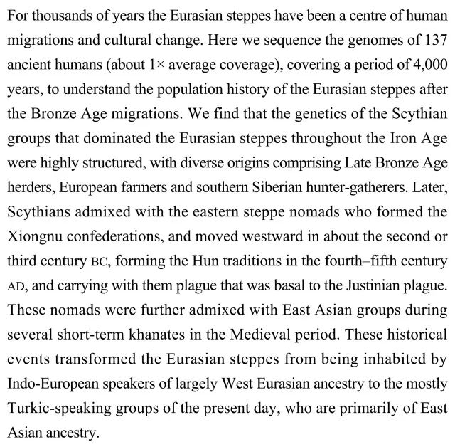 (导读 阿金)千百年来,欧亚大草原一直是人口迁徙和文化交流中心。本研究为了解青铜时代大迁移之后该地区的人口历史,对137名古代人类基因组做了测序,时间跨度约4000年。发现从铁器时代起统治草原的古西提人历经民族融合,其人口组成从青铜时代晚期印欧语系的西欧牧民逐渐过渡到如今的东亚突厥语系民族。