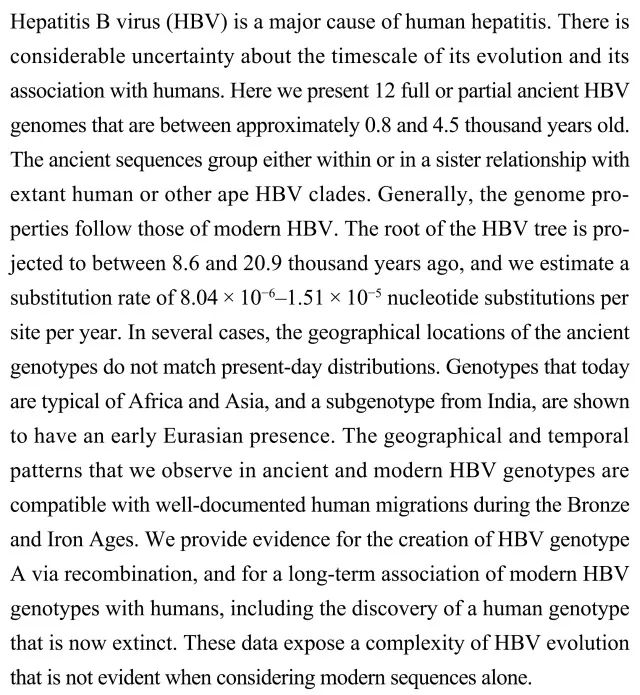 (导读 陈月欣)乙型肝炎病毒(HBV)是肝炎的主要病因之一。HBV 的演化历史及其与人类历史的联系尚不明确。我们通过研究12种古代及中世纪 HBV基因组发现,HBV 的演化树最早可追溯到 8600-20900 年前。另外,通过对比 HBV 现代与古代基因型的分布发现,HBV 亚型的时空分布与青铜及铁器时代人类迁徙路线相吻合。