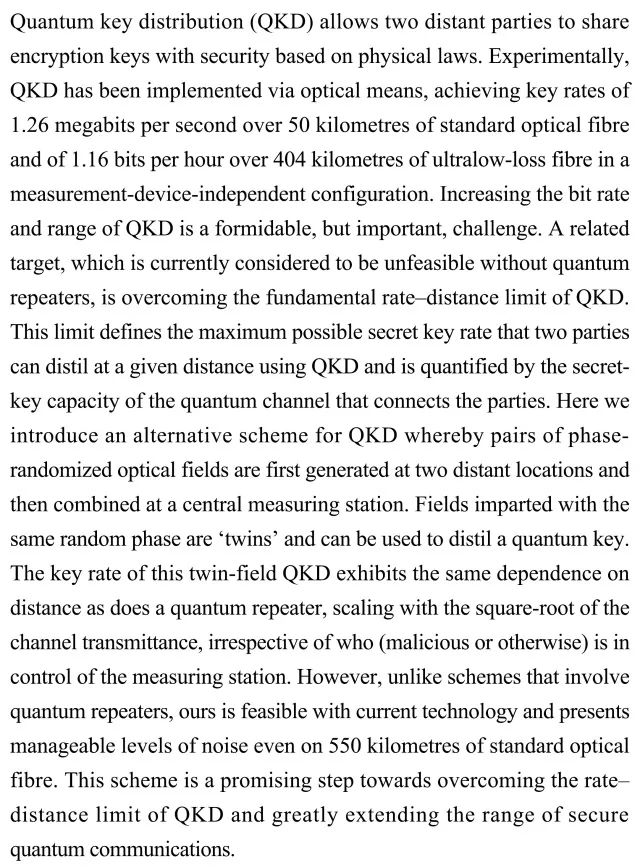 (导读 胡琦琳)量子密钥分发(QKD)要克服比特率-距离的限制,目前没有量子中继器还很难实现。本研究提出一种不使用量子中继器实现 QKD 的替代方法:在相隔很远的两地生成数对随机相位光场,之后在中央测量站组合。结果表明该方法可有效提取量子密钥。既能克服上述限制,又能极大扩展安全量子通信的范围。