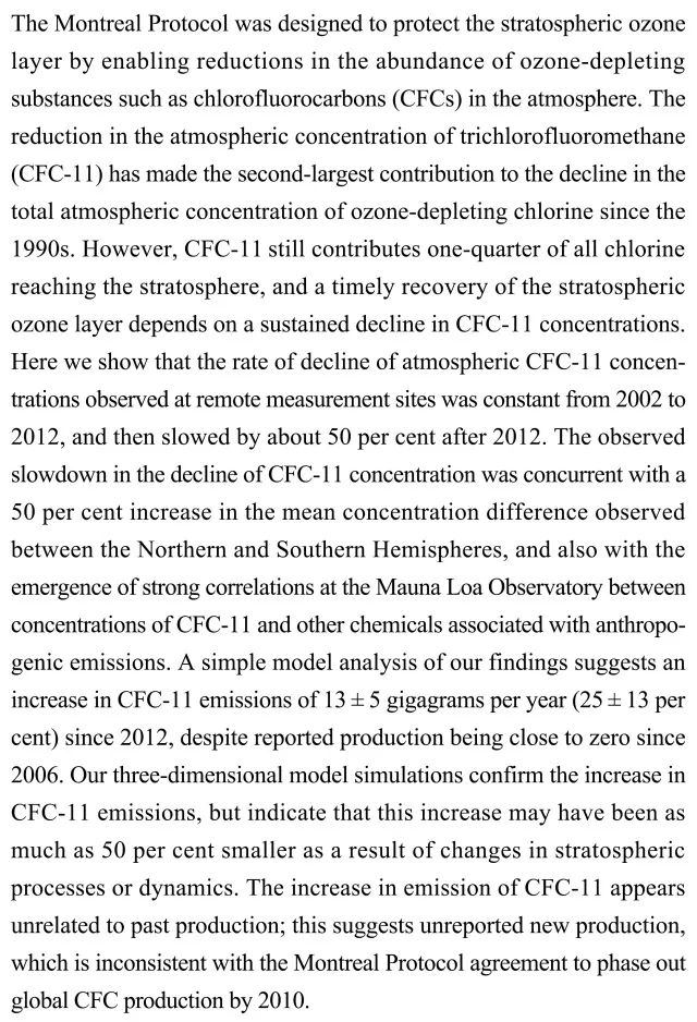 (导读 卓思琪)三氯氟甲烷(CFC-11)消耗臭氧层,平流层臭氧的恢复程度决于 CFC-11 浓度的持续下降。本研究发现从2002~2012年,大气层中CFC-11 浓度的下降速率不变,2012年后则减缓了约50%。三维模型模拟证实 CFC-11 排放量增加了,但与过去的产量无关,表明2010年后有未经报告且违反《蒙特利尔协议》的 CFC 产品排入大气。