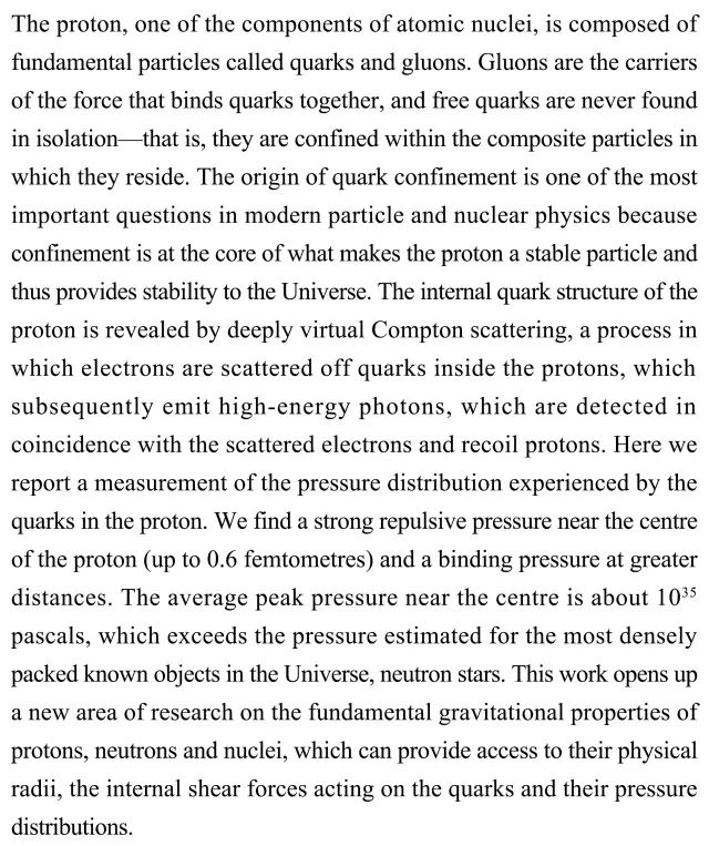 (导读 阿金)质子内部夸克禁闭(quark confinement)的起源一直是现代粒子物理和核物理的首要问题。本研究测量了质子内夸克承受的压力分布,发现距离质子中心约 0.6飞米附近有强大斥压强,而平均峰值压强则为1035