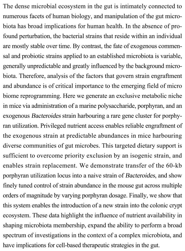 (导读 郭思瑶)人体肠道菌群对人体健康有着重要影响,但外源菌株在肠道内的定植情况常常不可预料。为了研究菌群定植的影响因素,我们通过给小鼠提供紫菜多糖(porphyran)和可代谢 porphyran 的外源拟杆菌创造了独特的代谢微环境,发现紫菜多糖的数量可有效调节肠道中的微生物水平,这有利于肠道的精准治疗研究。