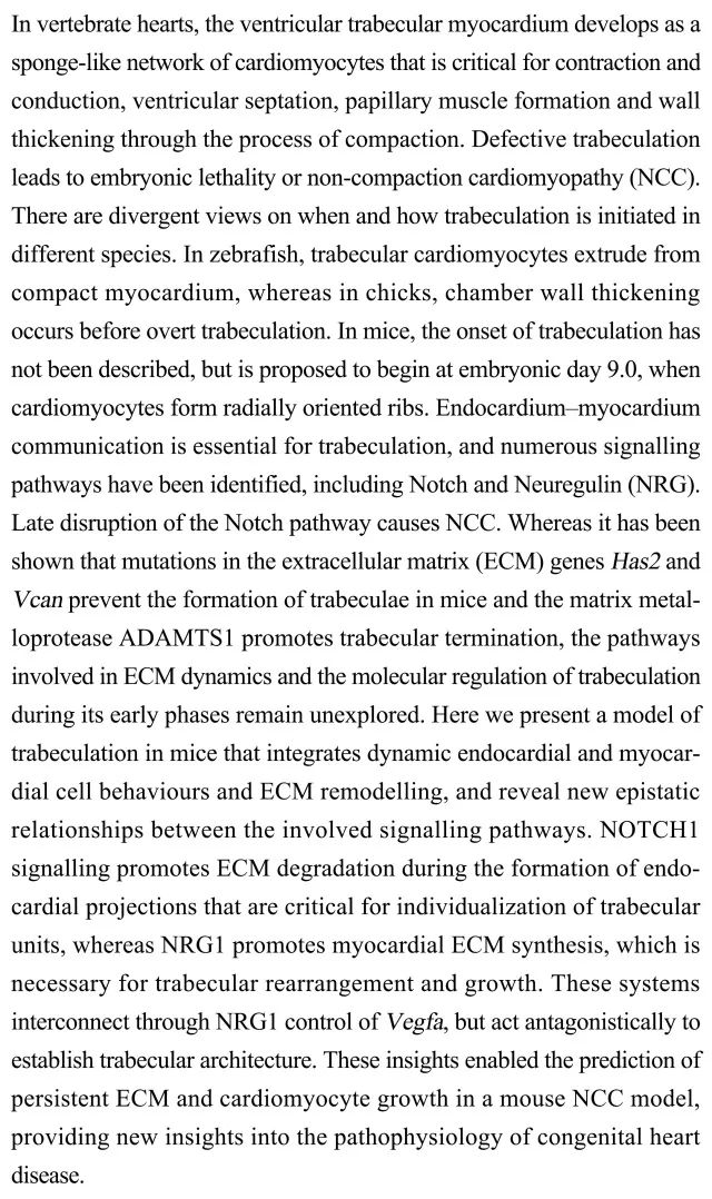 (导读 陈月欣)脊椎动物的心室小梁由心肌细胞组成的海绵状网络发育而成,对于心脏发育和机能至关重要,但其发育的早期分子调节机制尚不明确。本研究整合了心内膜和心肌细胞行为和胞外基质(ECM)重塑提出了小梁发育模型,我们发现 NOTCH1 促进 ECM 降解和推动小梁单元化,而NRG1 则促进心肌 ECM 合成控制小梁的重组和生长,为研究先天性心脏病病理提供了新思路。