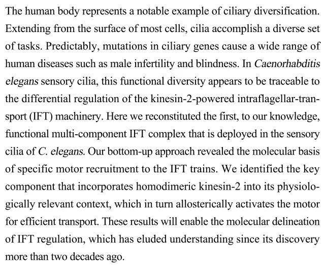 (导读 陈月欣) 人体细胞的纤毛种类与功能多样,纤毛基因突变可导致多种疾病。而在秀丽隐杆线虫中,感觉纤毛的功能多样性可追溯到驱动蛋白2纤毛内运输(IFT)的分化调控。本研究通过重建IFT复合体,揭示了马达蛋白的募集和工作机理,使得从分子层面上调控IFT成为可能。