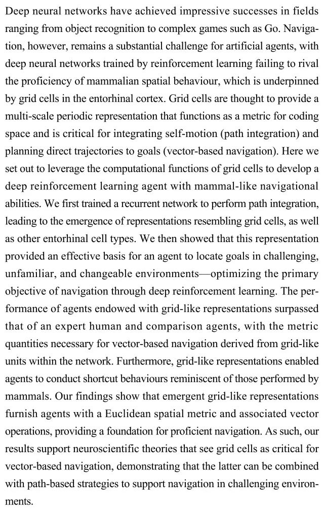 (导读 雷鸣)本研究报道在训练循环网络时,网络中自动出现类似哺乳动物网格细胞的表示单元,而经过深度强化学习的人工智能体能够像哺乳动物一样寻找目标,并优化路径。研究人员认为,基于矢量的类网格单元是智能体得以高效导航的基础,该结论也为神经科学中有关网格细胞是矢量导航决定因素的理论提供证据。