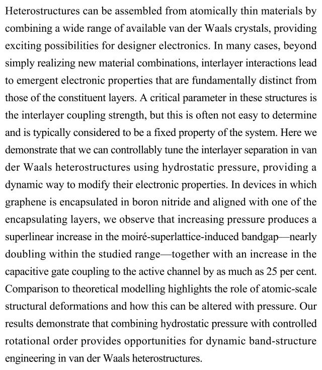 (导读 阿金)结合多种范得华晶体组装成的异质结构可用来设计各种电子器件,而其中的关键因素是夹层耦合强度。本研究实现了使用静水压力来谐调范得华异质结构夹层的分离。将石墨烯封装入氮化硼并对齐于其中的某一封装夹层,观察到压强与摩尔超晶格诱导的带隙呈超线性的依赖关系。研究结果为范得华异质结构的动态能带结构工程技术提供新思路。