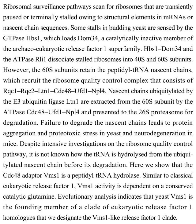 (导读 阿金)由于 mRNA 或者新生肽链序列的结构元素,核糖体会停滞下来。停滞的核糖体被分裂为 40S 和 60S 亚基,但 60S 会保留肽基-tRNA的新生肽链。目前尚未清楚泛素化的新生肽链中 tRNA 的水解机制。本研究展示 Cdc48 衔接子 Vms1 是一种肽基-tRNA水解酶,其活性依赖于保守的谷氨酰胺。演化分析表明酵母 Vms1 是真核释放因子1同源系物分支的基本组成。