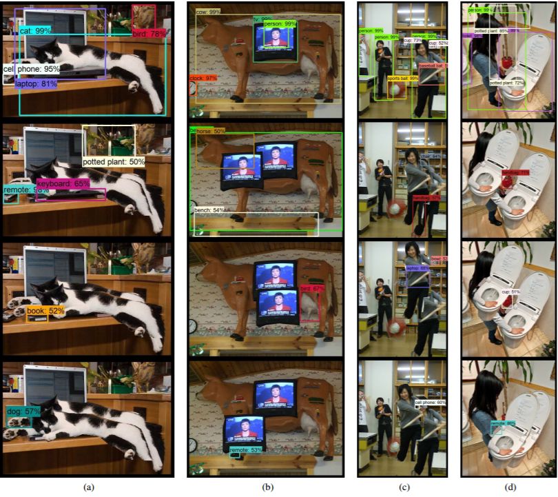 以下将展示特征干扰对检测过程的不利影响,这可能是对检测误差的合理解释。例如,考虑图 3(a)中的检测结果。一只部分可见的猫被检测到并归类为斑马。我们证实,从不属于实际目标(cat)的像素中获得的特征对指定的类有影响。这点同样适用于目标感兴趣区域(ROI)以内及以外的像素:在图 3(b)中,我们将边界框外的所有像素都设置为零。检测结果不变。当我们把边界框内的像素也归零,留下属于猫的像素时,得到的标签也会变成「猫」。这显示了 ROI 内像素的影响。然而,当我们将 ROI 之外的背景强度随机化时,标签会变成「狗」。这表明 ROI 之外的特征会影响检测的最终结果。此次实验是用 Yolov3[8] 方法的 PyTorch 端口执行的,速度非常快,产生的结果与目标检测的最新水平相当。这种情况下的最终分类需要依赖来自卷积层单个网格单元的特征。