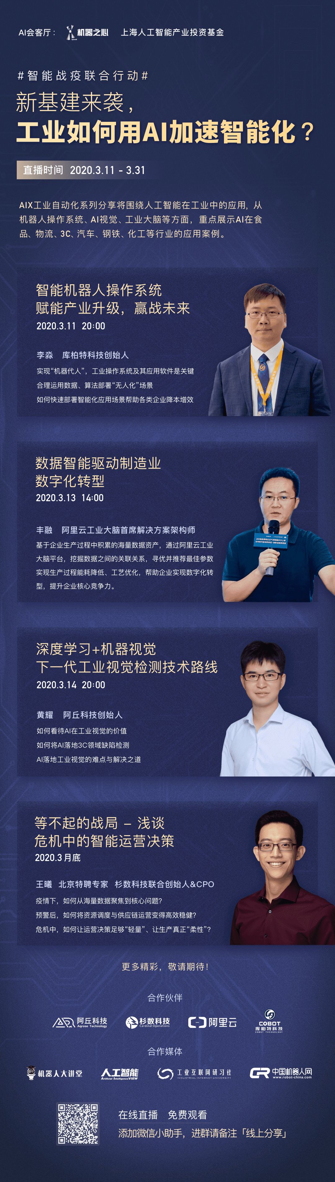 在此背景下,机器之心「智能战疫联合行动」在线分享活动第二个系列-AIX 工业自动化将重点关注人工智能在工业中的应用,覆盖协作机器人、工业 AI 视觉、智能排程、工业大脑等产业热点话题。从 3 月 11 日起,整个 3 月精彩不断,多位顶级专家倾囊分享,为大家带来一场产业革新的盛宴。具体安排如下: