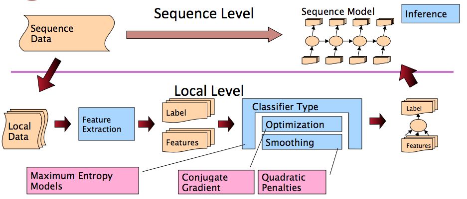在 Stanford NER 里,用的其实是 IO encoding,有两个原因,一是 IO encoding 运行速度更快,二是在实践中,两种编码方式的效果差不多。IO encoding 确定 boundary 的依据是,如果有连续的 token 类别不为 O,那么类别相同,同属一个 NE;类别不相同,就分割,相同的 sequence 属同一个 NE。而实际上,两个 NE 是相同类别这样的现象出现的很少,如上面的例子,Sue,Mengqiu Huang 两个同是 PER 类别,并不多见,更重要的是,在实践中,虽然 IOB encoding 能规定 boundary,而实际上它也很少能做对,它也会把 Sue Mengqiu Huang 分为同一个 PER,这主要是因为更多的类别会带来数据的稀疏。