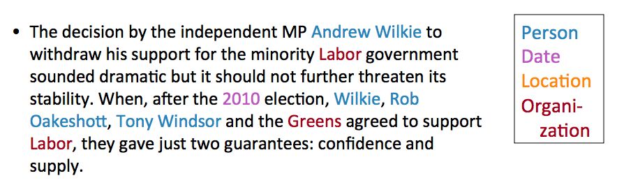 而计算 precision,recall 的时候,我们会发现,对 ORG - (1,4) 而言,系统产生了一个 false negative,对 ORG - (2,4) 而言,系统产生了一个 false positive!所以系统有了 2 个错误。F1 measure 对 precision,recall 进行加权平均,结果会更好一些,所以经常用来作为 NER 任务的评估手段。另外,专家提出了别的建议,比如说给出 partial credit,如 MUC scorer metric,然而,对哪种 case 给多少的 credit,也需要精心设计。