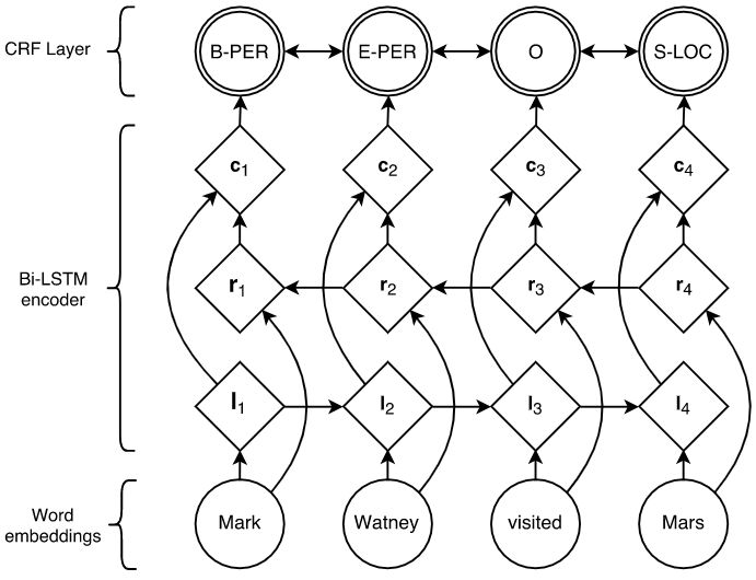 最经典的 LSTM+CRF,端到端的判别式模型,LSTM 利用过去的输入特征,CRF 利用句子级的标注信息,可以有效地使用过去和未来的标注来预测当前的标注。
