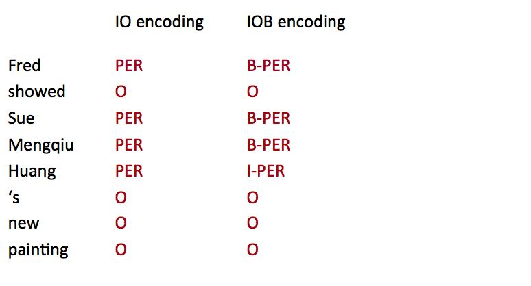 看一下最常用的两种 sequence labeling 的编码方式,IO encoding 简单的为每个 token 标注,如果不是 NE 就标为 O(other),所以一共需要 C+1 个类别(label)。而 IOB encoding 需要 2C+1 个类别(label),因为它标了 NE boundary,B 代表 begining,NE 开始的位置,I 代表 continue,承接上一个 NE,如果连续出现两个 B,自然就表示上一个 B 已经结束了。