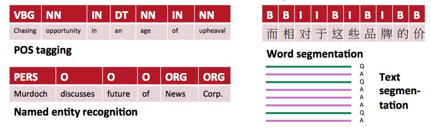 NLP 的很多数据都是序列类型,像 sequence of characters, words, phrases, lines, sentences,我们可以把这些任务当做是给每一个 item 打标签,如下图: