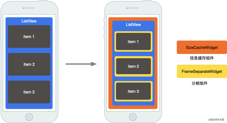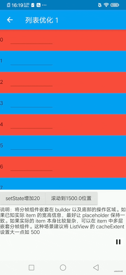 对于列表,在每一个 item 中嵌套 FrameSeparateWidget,并将 ListView 嵌套在 SizeCacheWidget 内即可。