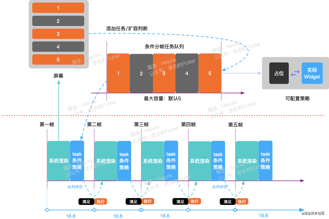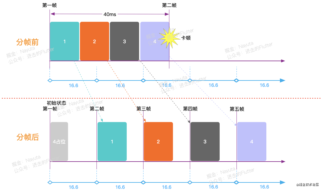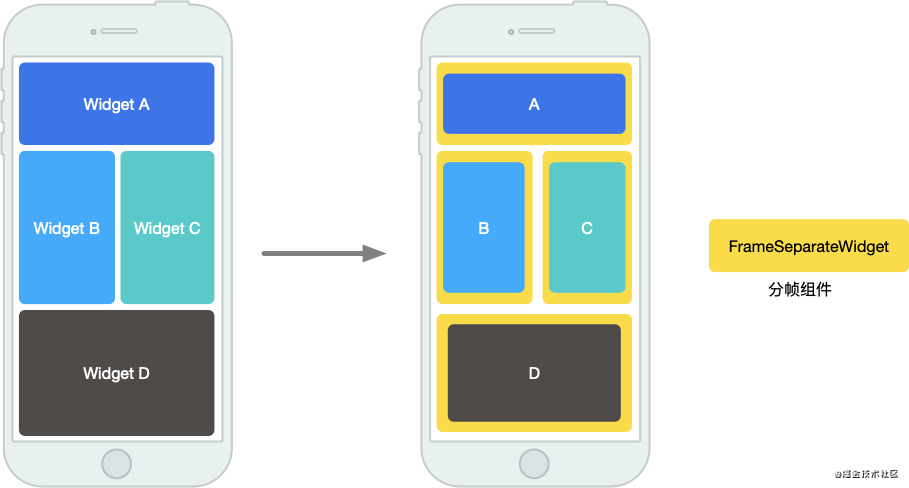 卡顿的页面往往都是由多个复杂 widget 同时渲染导致。通过为复杂的 widget 嵌套分帧组件 FrameSeparateWidget。渲染时,分帧组件会在第一帧同时渲染多个 palceHolder,之后连续的多帧内依次渲染复杂子项,以此提升页面流畅度。