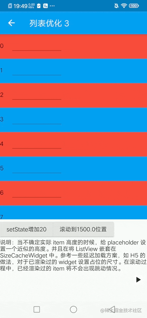 在列表情况下,给 ListView 嵌套 SizeCacheWidget,同时建议将预加载范围 cacheExtent 设置大一点,例如 500 (该属性默认为 250),提升慢速滑动时候的体验。