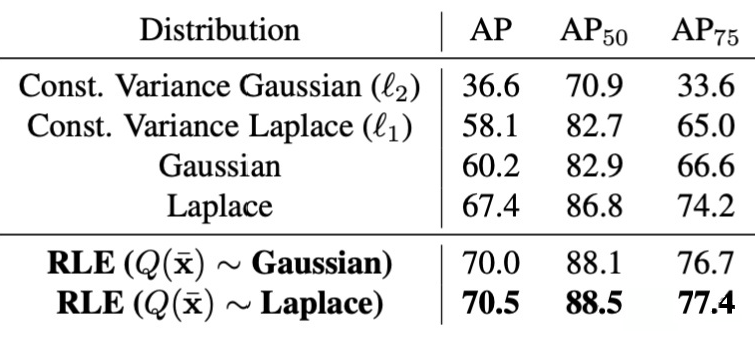不同假设条件下的分布作为受控的变量,RLE 组织了一系列对比实验。从恒方差的高斯/拉普拉斯分布,到变方差的高斯/拉普拉斯分布,最后再到不同初始分布下的 RLE 学习到的分布,同一个 backbone 下性能差异可谓云泥之别。普遍而言,拉普拉斯分布更加符合关节标注的稀疏特性 ,因此往往可以取得更好的效果。但随着分布的灵活度 和可变性 的增加,二者的差距也在不断的减少。由于 RLE 采用的 flow 方法对分布具有非常出色的学习能力,因此最后两种分布的差异已经减少到只剩 0.5%mAP 了。