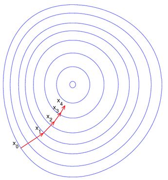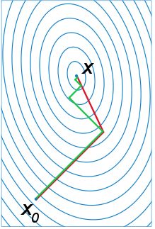 下图为共轭梯度法和梯度下降法搜索最优解的路径对比示意图: