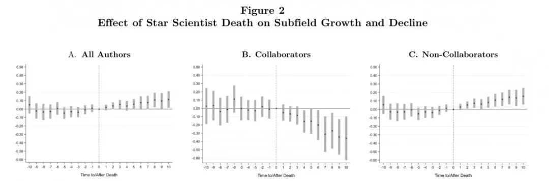 研究发现,科研明星们去世后,在他们所属的学科分区(subfield)里,从未与他们合作过的科学家们的文章发表数量提升了 8.6%。所有的影响都与控制组分区相对比,即那些科研明星们仍然在世的分区。
