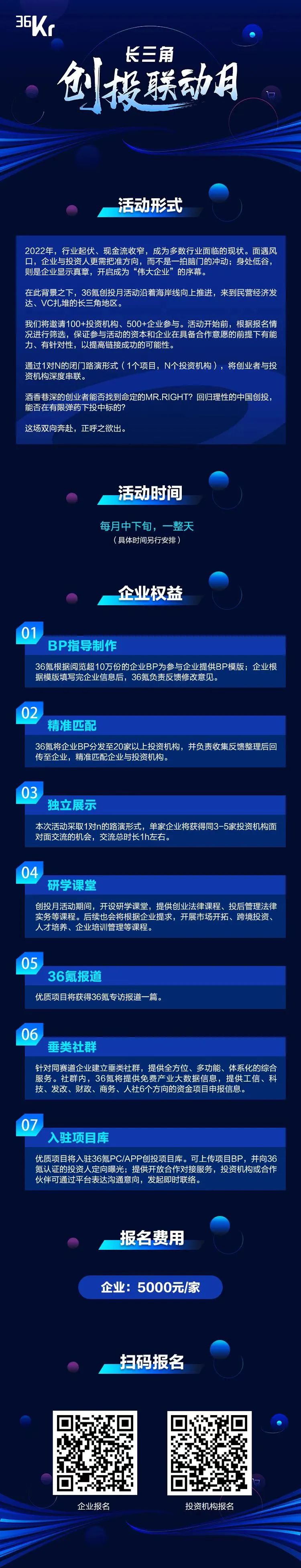 本次长三角创投月将从8月开始,一直持续到今年年底。每月中下旬开启路演活动,具体举办时间、地点另行通知。企业报名费用为每家5000元。