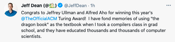 沸腾了!影响了数代人的「龙书」著作者,荣获图灵奖! 刚刚,ACM授予「龙书」的两位作者——哥伦比亚大学教授阿尔佛雷德·艾侯 (Alfred Aho)和斯坦福大学教授杰弗里·戴维·乌尔曼(Jeffrey David Ullman)。 表彰他们在编程语言实现方面基础算法和理论方面的成就,此外,两位教授还将自己的研究成果编成教材,影响、教育了几代计算机科学家和程序员。 Jeff Dean发推祝贺:「研究生时上编译课用了龙书,非常愉快的回忆。」 他提到的龙书就是被领域内学者奉为圭臬的《编译器设计原理》,也是艾侯和乌尔曼二人献给全世界数百万软件程序员的最佳礼物。 「龙书」CP:多次合著,启蒙一代代程序员 如果没有一种叫做编译器的重要软件开发工具,我们就会陷入机器代码喃喃自语的世界,然后才能控制计算机。 这就是为什么帮助开发编译器的两位研究人员,艾侯和乌尔曼,获得了2020年图灵奖。 为现代编程语言做这种编译的大部分技术都要归功于艾侯和乌尔曼。 故事开始于1967年,在贝尔实验室,艾侯和乌尔曼塑造了编程语言理论和实现的基础,以及算法设计和分析。 他们通过技术贡献和有影响力的教科书,对编程语言编译器做出了奠基性贡献。 二人在算法设计和分析技术方面的早期合作,也为这一时期出现的计算机科学理论核心做出了重要贡献。 艾侯和乌尔曼一起写了很多本书,比如: The Theory of Parsing, Translation, and Compiling:1-2,1972,1973 The Design and Analysis of Computer Algorithms,1974 《编译器设计原理》(Principles of Compiler Design),1977 Data Structures and Algorithms, 1983. 《编译.原理.技术与工具》(Compilers: Principles, Techniques, and Tools) 1986. Foundations of Computer Science, 1992. 其中,他们最广为人知的两本书: 《计算机算法的设计与分析》(1974年)The Design and Analysis of Computer Algorithms 本书被认为是该领域的经典之作,是十多年来计算机科学研究中被引用最多的书籍之一。在计算机科学还是一个新兴领域的时候,它就成为全世界算法课程的标准教材。该书还引入了随机存取机(RAM)作为利用递归关系分析计算机算法的时间和空间复杂性的基本模型。RAM模型还将不同的单个算法编成了一般的设计方法。 另外,龙书——《编译器设计原理》(1977年)Principles of Compiler Design 这本书的封面是一名骑士和一只龙,因此被人称为龙书,又因为那只龙是绿色的,所以称为「绿龙书」。 9年后的1986年,原来的两位作者加上Ravi Sethi,对此书做了一个升级,书名改为Compilers: Principles, Techniques and Tools, 封面依然沿用骑士和龙,龙变成了红色,因此被叫做「龙书二」或者是「红龙书」。 2006年年底,龙书再次升级了。作者又多了一位Monica S. Lam,名字沿用Compilers: Principles, Techniques and Tools, 封面依然保持恐龙和武士的设计,但这次的龙是紫色,因此叫做「紫龙书」。 阿尔佛雷德·艾侯 阿尔佛雷德·艾侯(Alfred Aho)(1941年)目前是哥伦比亚大学荣誉教授。1995年,艾侯加入了哥伦比亚大学计算机科学系,1995年至1997年担任该系主任,2003年春再次担任该系主任。 他目前主要研究量子计算、编程语言、编译器和算法。 艾侯教授拥有多伦多大学工程物理学学士学位和普林斯顿大学电气工程/计算机科学博士学位,他曾获得IEEE冯·诺伊曼奖,也是美国国家工程学会和美国艺术与科学学会的成员,还是加拿大皇家学会会员。 2017年,他与乌尔曼和约翰·霍普克洛夫特三人一起获得了「C&C奖」。他还是美国科学促进会、ACM、贝尔实验室和IEEE的研究员。 左二为艾侯教授,右一为乌尔曼教授 艾侯教授因其关于算法和数据结构、编程语言、编译器以及计算机科学基础的许多论文和书籍而闻名。 「编程语言AWK」中的「A」就代表艾侯教授Aho,另两个字母代表另外两名开发者:「W」是 Peter Weinberger,「K」是Brian Kernighan. 他还编写了作为 UNIX 一部分的字符串模式匹配实用程序 egrep 和 fgrep 的初始版本; fgrep 是现在被称为 Aho-Corasick 算法的第一个广泛使用的实现。 加入哥伦比亚大学之前,他是贝尔实验室计算机科学研究中心的VP。 杰弗里·乌尔曼 杰弗里·戴维·乌尔曼(Jeffrey David Ullman)(1942年生)是美国计算机科学家,也是斯坦福大学Stanford W. Ascherman工程学老教授。 他所著的关于编译器的教材《编译器设计原理》(Principles of Compiler Design),通常被称为「龙书」,计算理论的书(与他人合著)《自动机理论、语言和计算导论》(Introduction to Automata Theory, Languages, and Computation)被称为「灰姑娘书」(Cinderella book),另外还有数据结构和数据库的教材,这些书都被视为所在专业的标准。 「灰姑娘书」本书的封面描绘了一个女孩(可能是灰姑娘)坐在一个鲁布·戈德堡装置前 手里拿着一根从里面出来的绳子。而封底,在她拉动绳子后,这个装置变得一片狼藉。 乌尔曼于1963年从哥伦比亚大学获得工程数学理学学士学位,1966年获得普林斯顿电气工程专业博士学位。 此后,他在贝尔实验室工作了好几年。1969年到1979年期间,他在普林斯顿大学任教。自1979年以来,他一直是斯坦福大学的教授,目前已经荣退。 1995年,他被选为ACM Fellow;2000年,他被授予高德纳奖。2010年,他还与John Hopcroft一起获得了IEEE冯·诺依曼奖,他们的贡献「为自动机和语言理论领域奠定了基础,并为理论计算机科学做出了许多开创性的贡献。」 乌尔曼的研究兴趣包括数据库理论、数据集成、数据挖掘和使用信息基础结构的教育。 他是