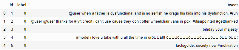 可以看到,数据一共有三列:id、标签和推文文本。标签是二进制目标变量,而推文包含我们将清洗和预处理的文字。以下是数据预处理的几个要求: