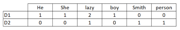 它们包含的唯一词例是[‘He’,’She’,’lazy’,’boy’,’Smith’,’person’],所以D=2,N=6,矩阵M=2×6,也就是: