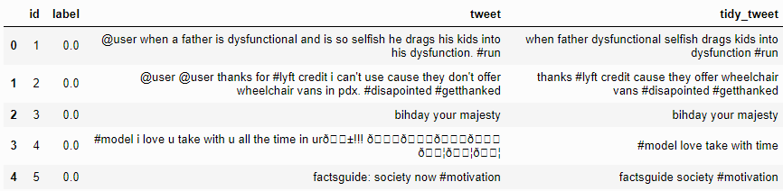 combi [ 'tidy_tweet' ] = np.vectorize(remove_pattern)(combi [ 'tweet' ],“@ [\ w] *” )
