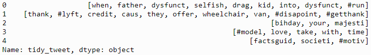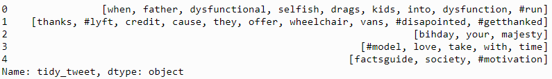 tokenized_tweet = combi['tidy_tweet'].apply(lambda x: x.split())