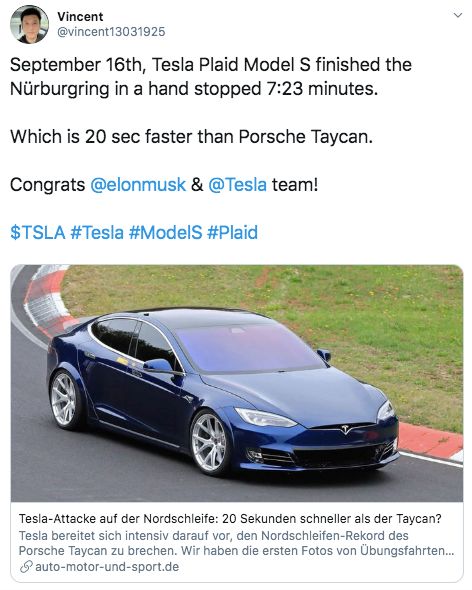 比如9月16日,特斯拉在纽伯格林赛道上使用“ Plad Powertrain” Model S以7分23秒的成绩成功打破保时捷Taycan单圈纪录,比保时捷Taycan快19秒。