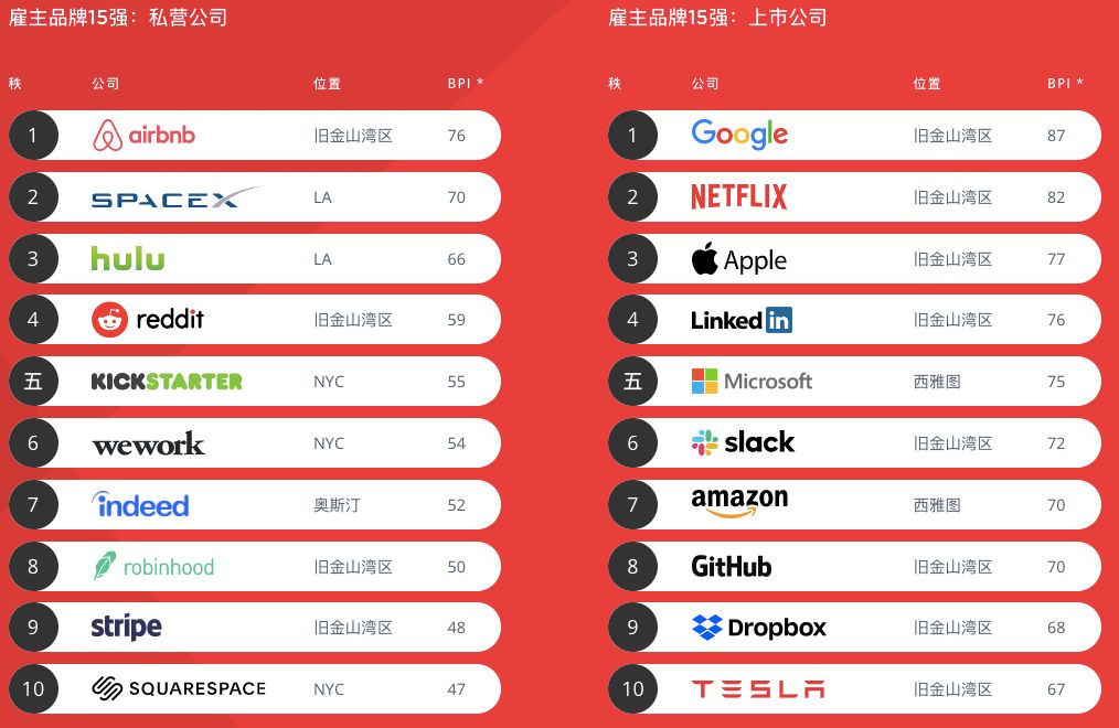 其中,上市公司Top 5分别是:谷歌、NETFLIX、苹果、Linkedin和微软;私人公司Top 5分别是:Airbnb、SpaceX、hulu、reddit和Kickstarter。