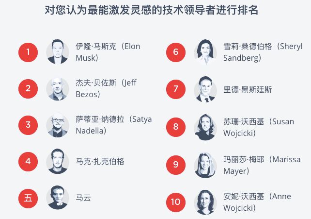亚马逊创始人杰夫·贝佐斯(Jeff Bezos)、微软CEO萨蒂亚·纳德拉(Satya Nadella)、Facebook创始人马克·扎克伯格(Mark Zuckerberg)和阿里巴巴创始人马云位列前五。
