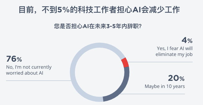 目前,仅4%的科技工作者担心AI在3-5年内会让自己失业,20%的科技工作者认为“或许10年之后”,76%的科技工作者现在并不担心。