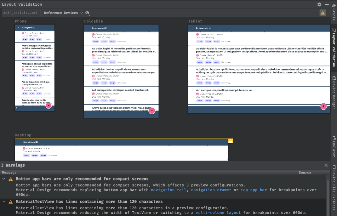 在调整大屏幕 UI 时,如果您不确定从哪里开始入手,您可以首先使用新的工具来发现可能会对大屏幕设备造成影响的潜在问题。我们正在 Android Studio Chipmunk 中开发一个新的可视化的 lint 工具,用于在布局验证中主动显示 UI 提醒和建议,包括哪些参考设备会受到影响。
