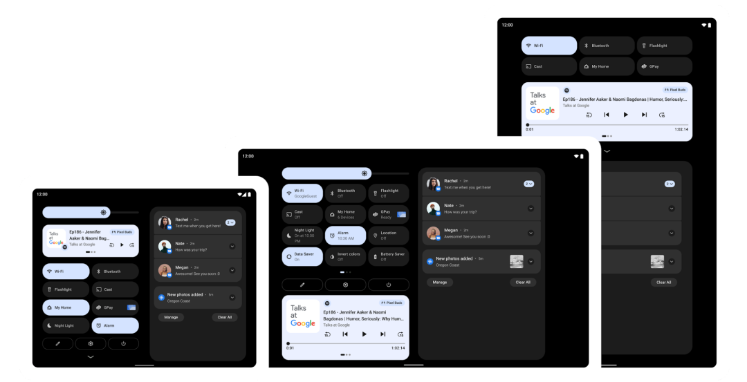 为了向用户提供最佳的导航体验,您应该提供针对用户设备窗口尺寸类量身定制的导航界面。推荐的导航模式包括适用于紧凑屏幕的导航栏,以及适用于中等屏幕宽度的设备类和更大屏幕设备 (600dp 以上) 的导航栏。对于屏幕更宽的设备,我们新发布的 Material Design 指南中提出了几个有关大屏幕布局的方案,例如可以使用 SlidingPaneLayout 来实现列表/细节结构。您可以查看指南,了解如何在 View 和 Compose 中实现响应式 UI 导航。