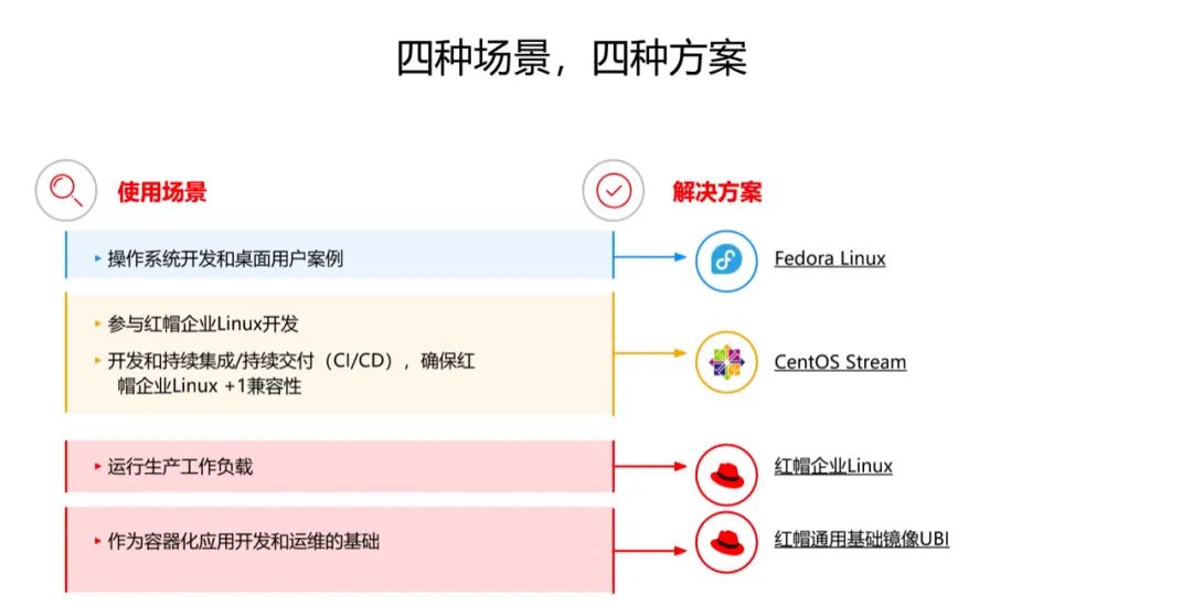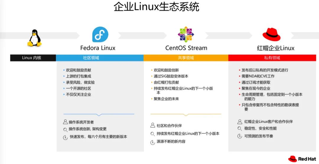因此,自 2014 年开始,红帽企业级 Linux 生态系统形成了 Fedora、RHEL 和 CentOS Linux 协同发展的局面,社区上游通过 Fedora 向广大开发工程师提供桌面操作系统的持续创新和技术架构整合,大约是每 6 个月发布一个版本;中游是红帽企业级 Linux,主要面向广大企业和应用开发商,特点是稳定、安全和性能优化;下游是社区领导的 CentOS Linux,面向成本敏感用户和生态开发者,特点是无成本、易获取,大约在红帽企业 Linux 发布的几个月后发布。