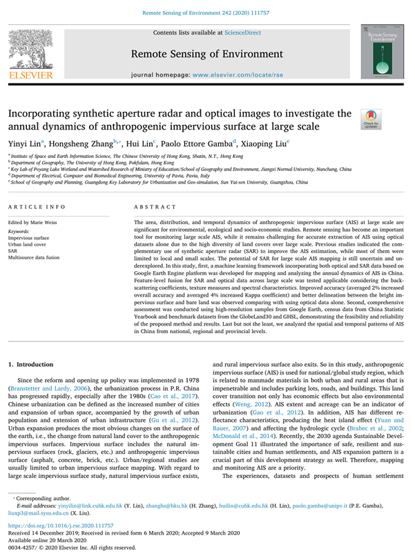 引用格式:Lin, Y., Zhang, H., Lin, H., Gamba, P. E., & Liu, X. (2020). Incorporating synthetic aperture radar and optical images to investigate the annual dynamics of anthropogenic impervious surface at large scale. Remote Sensing of Environment, 242, 111757.