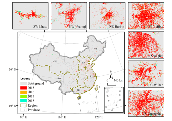 2015年到2018年的不透水面提取结果为图1,文章选取了7个典型区域进行不透水面变化的展示,可以看到不透水面在华北、东部、华南地区相对密度高且紧凑,而西北、北部、和中部地区的分布则相对比较稀疏。