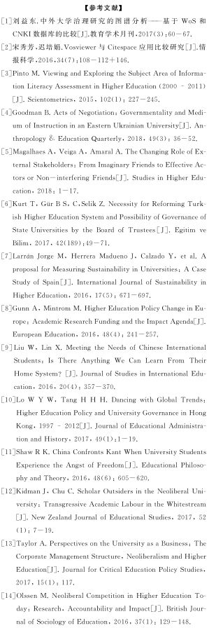 1.将大学治理置身于全球化背景下加以考察。国外大学治理研究多在全球化背景下加以考察,特别关注全球化对大学治理的影响,尤其是在大学治理模式变革方面,认为全球化格局带来关于大学理念、治理模式以及教师和学生的全球流动。此种趋势在一定程度上助推全球高校的治理模式向西方(主要是美国和欧洲)学习,形成了“中心-边缘”[36]的理念和治理格局。因此,大学治理领域的经典模式也通常称之为美国模式和欧洲模式。但自2016年以来,全球范围内的逆全球化风潮正转变着全球化走向:英国脱欧,美国退出TPP、退出联合国教科文组织以及对中国发起贸易战等,都深刻影响着全球化的新走向。与此相对应的是中国完全不同的全球化主张,实施“一带一路”倡议,构筑“人类命运共同体”等中国的全球化策略。随着大学成为社会中心,经济与政治的全球变革与大学息息相关,不同的全球化取向也将深刻影响大学治理的变革。如何在具有张力的全球价值观中取得平衡,考验着大学治理的权变性和适应性。因此,在更为宏大的全球化背景下重新审视中外的大学治理,着重考察和比较美国“逆全球化”策略引领下的高等教育变革和中国“新全球化”策略引领的大学治理改革,具有重要的理论价值和实践意义,或会影响全球大学治理模式的新走向。