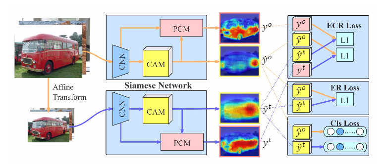 所以,为了将正则化集成到原始网络上,将网络扩展为共享权重的孪生结构。一个分支在网络输出上应用转换,另一个分支在网络前馈之前,通过相同的变换扭曲图像。对来自两个分支的输出激活图进行正则化,以确保CAM的一致性。两个网络的的输入分别是原图和经过仿射变换之后的图,通过孪生网络的映射,形成新的表示,然后再设计Loss使得这两个表示尽可能的小,也就是loss尽可能的小,从而显性的给网络加上前面所提到的等变约束。