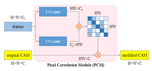 尽管等变正则化为网络学习提供了额外的监督,但仅通过经典卷积层很难实现理想的等方差。自我注意是捕获上下文信息并细化逐像素预测结果的有效模块。整合方程式给出的经典自我注意模块。 为了通过上下文信息进一步细化原始CAM,在网络末端提出了一个像素相关模块(PCM),以集成每个像素的低级特征。