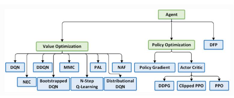 Coach 支持许多顶级的强化学习算法,主要可分为两类:价值优化与策略优化,如下图所示。