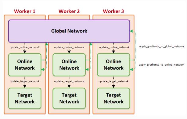 大多数强化学习智能体包含网络的多个拷贝。这些拷贝将作为主网络的副本并以不同的速率更新,通常在本地或者在并行的工作系统中同步。为了使拷贝的同步更容易,将这些拷贝封装为简化的 API,从而可使智能体忽略背后复杂的细节。