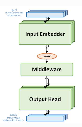 每一个智能体至少有一个神经网络作为函数近似器用于选择 action。该网络是模块化设计的以便在不同的智能体中复用。它由三个主要部分组成: