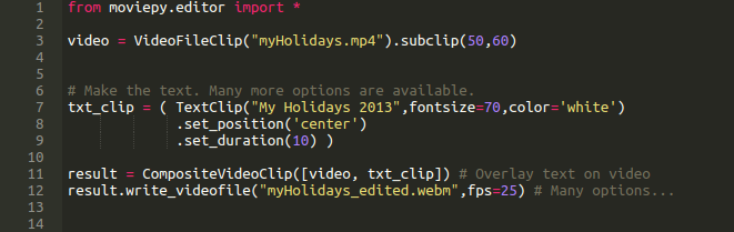 在这个例子中,我们打开一个视频文件,在t = 50s的时刻和t = 60s的时刻之间选择子剪辑,在屏幕中心添加一个标题,并将结果写入一个新文件: