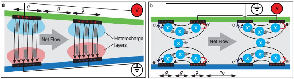 产生的离子(X-)被电场加速,直到它们在阳极放电,沿着它们的路径拖动中性液体,从而导致流体流动。